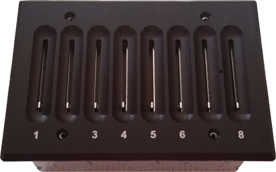 The Preset 8 is a lighting control station that stores eight preset looks. Each look, or scene, has an associated slider that adjusts the light levels for that look. The preset looks are recorded into the Preset 8 by capturing the output of any DMX512 console.